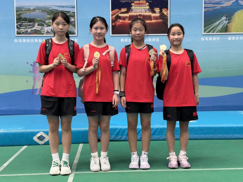 女子双蹦床团体赛冠军从左至右:李茜楠、史嘉锌、杨听、石欣路
