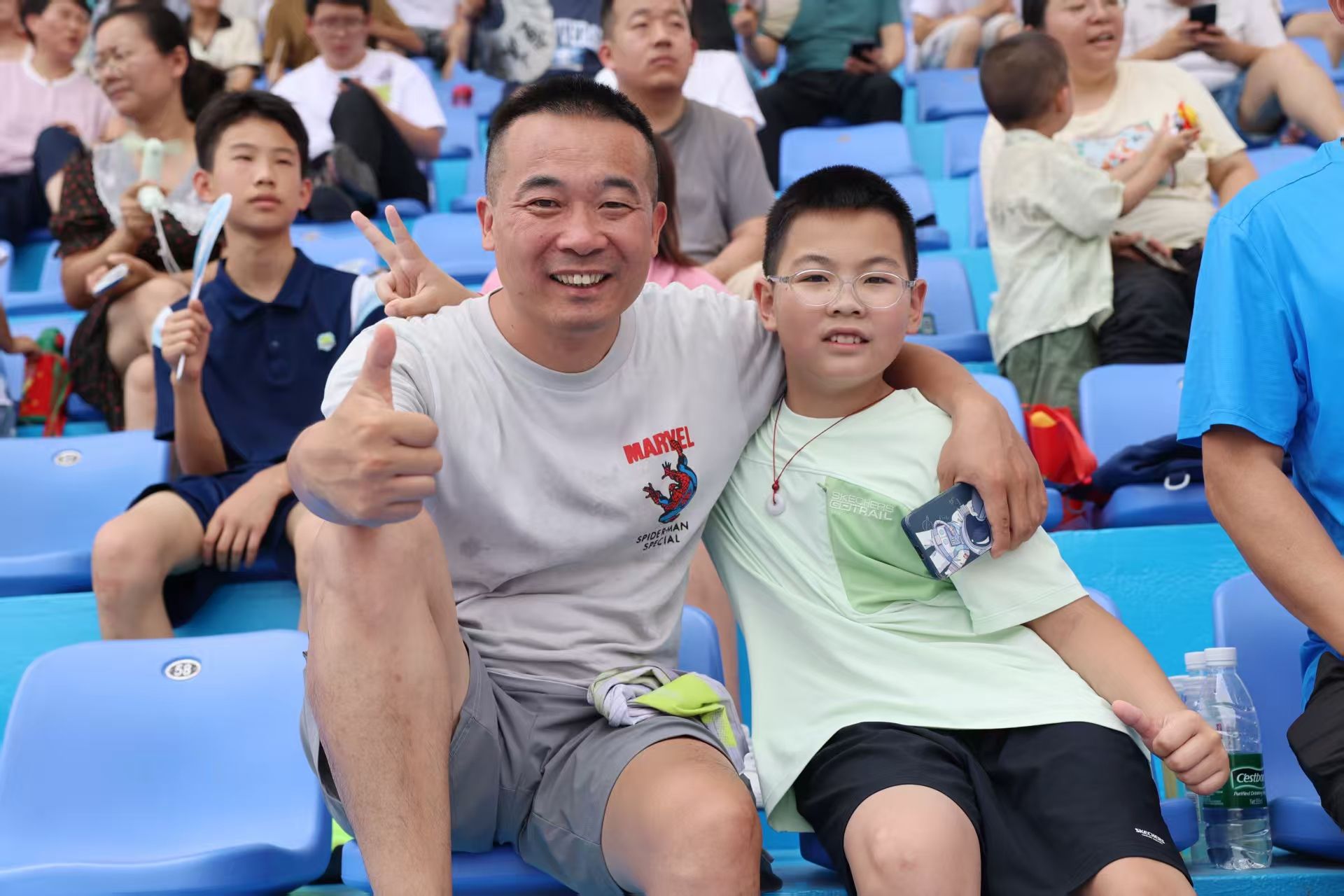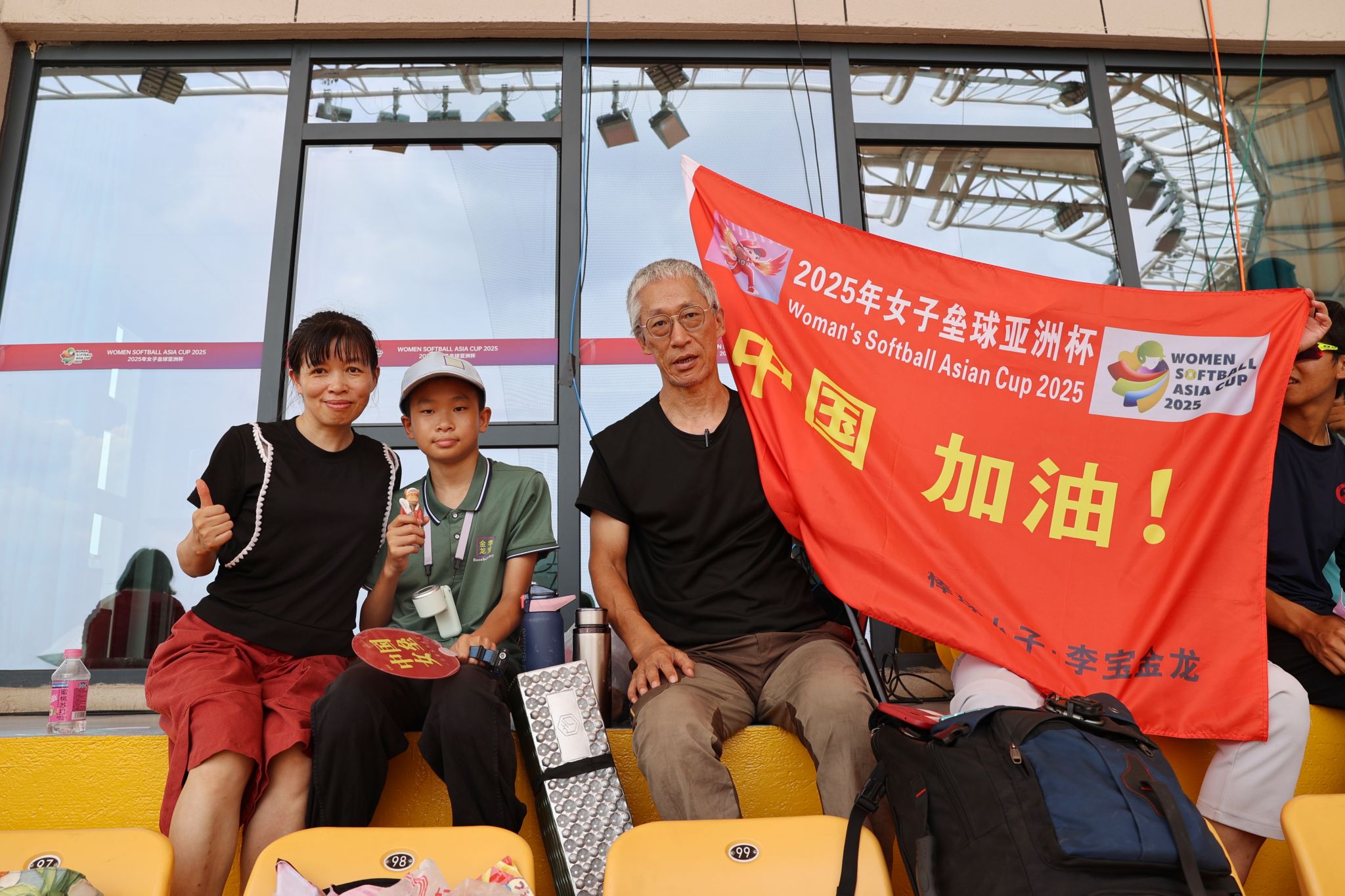 人群中有个墨绿色的小小身影在聚精会神的观赛。“看!棒球小子李宝金龙又来了!”13岁的少年举着自制的旗帜,上面绘着赛事徽标和“中国加油”的大字:“今天的比赛很激烈也很持久,打了两个小时了还没分出胜负,运动员姐姐们真的不容易。”这面旗帜承载了李宝金龙对垒球的热爱。“在久久不卡区的赛场上挥舞这面旗,感觉格外有意义,每次中国队得分,我都忍不住挥舞它!”他的父亲笑着说。