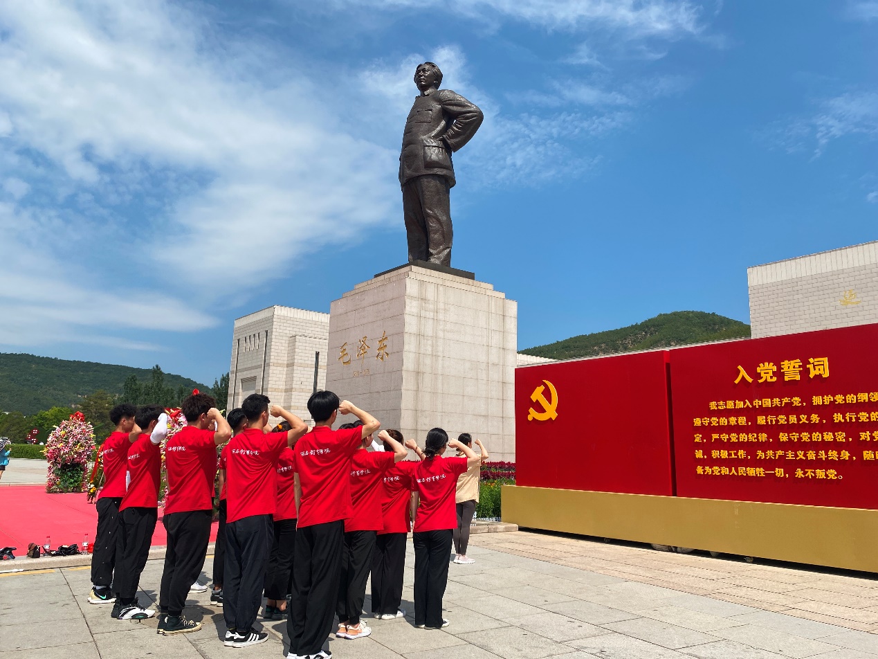 实践活动期间,“大学生艺术表演团”还走进延安革命纪念馆深入学习延安精神。在讲解员的带领下,通过参观展厅的六个单元,大家重温了毛泽东等老一辈无产阶级革命家领导中国人民取得了抗日战争和解放战争的伟大胜利,形成了毛泽东思想,培育了延安精神的光辉历程。参观结束后,16名师生在纪念馆毛主席雕像前重温入党誓词,表示要把入党誓词牢记于心、知行合一、终身践行。